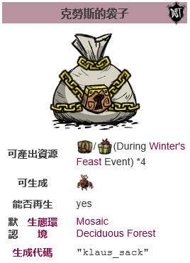 克劳斯的袋子(赃物袋)是多人版饥荒中独有的物品,一般出现在落叶林或马赛克混合地。