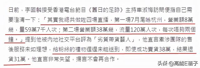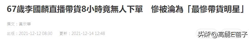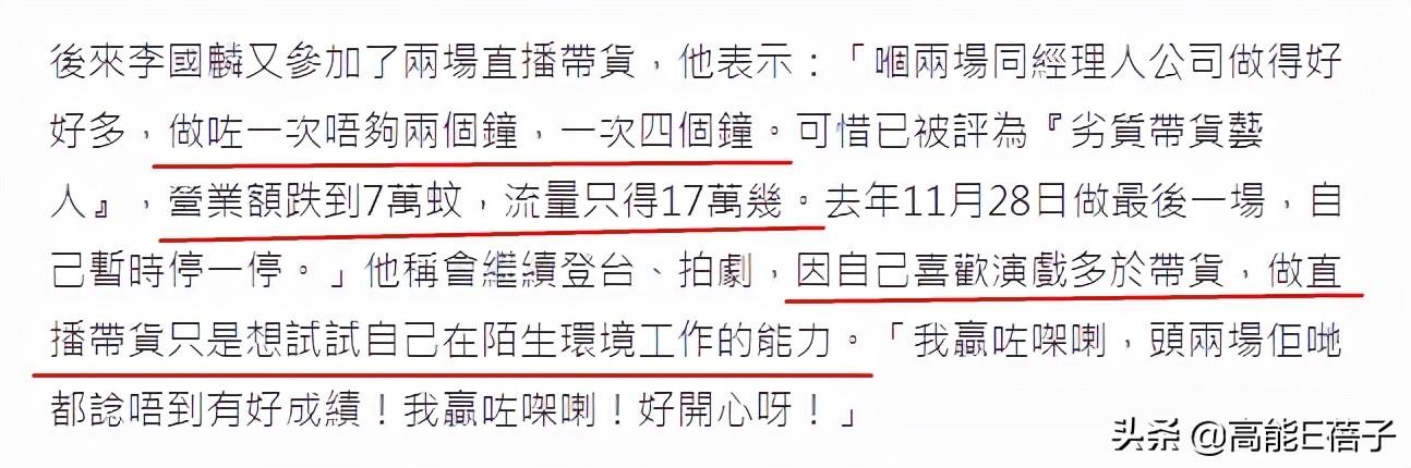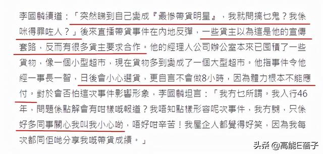 他另一个大的争议,便是在2021年末一次直播带货时,他整整8直播了小时,疲惫到双眼布满血丝,直播间虽有1000多位观众,且只有10次货品上架,但一直没有人下单买货,最终只卖出200块营业额,港媒还封他为最惨带货明星、劣质带货艺人。