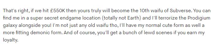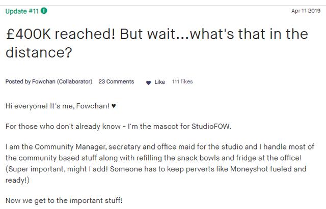之后就是重点了,这篇署名“Fowchan”的回复中表示众筹接下来的惊喜就是她自己,如果最终众筹数额达到55万英镑的话,玩家们就能在游戏中拥有第十位老婆(waifu)。