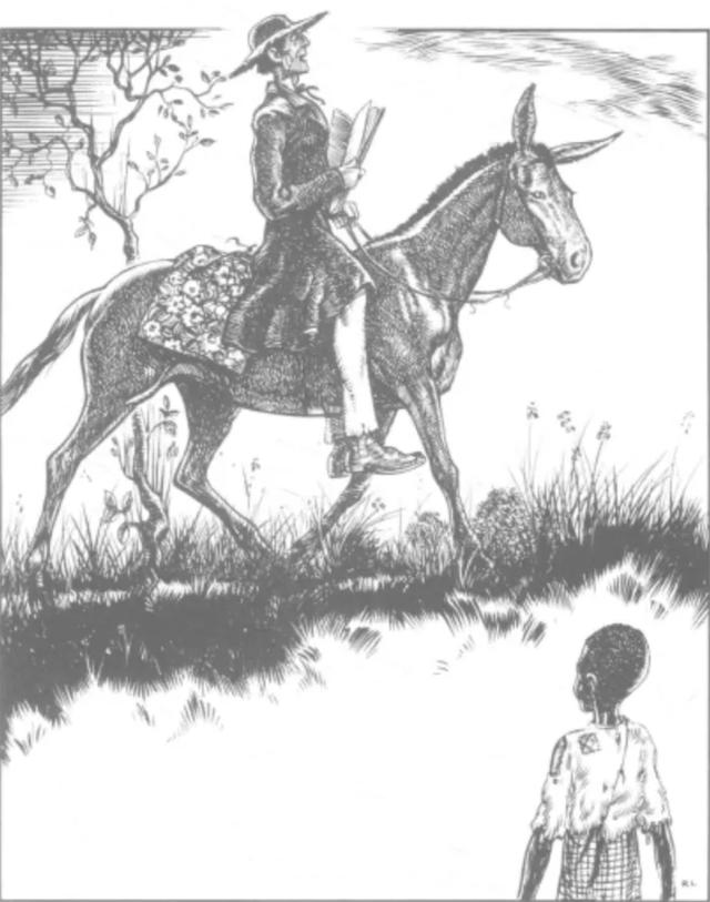 在绘本中图片对应的文字为:……(我父亲的父亲)常常骑着那头骡子从一个镇到另一个镇,与撒旦进行战斗。