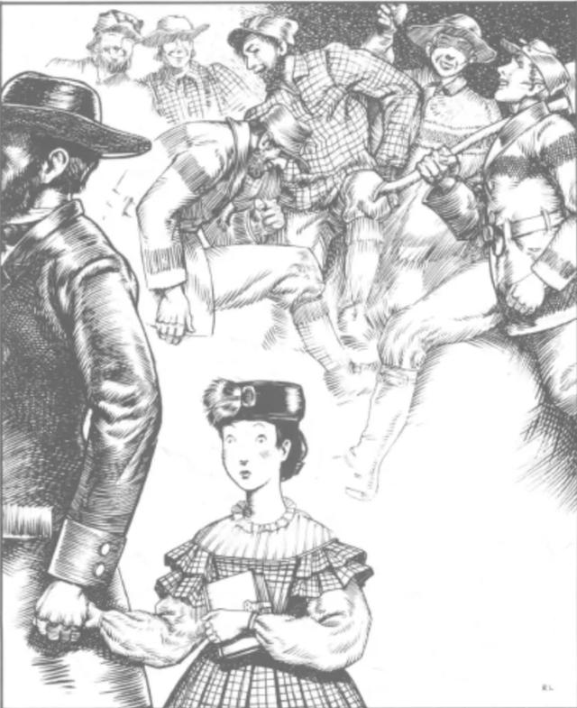 在绘本中图片对应的文字为:……那里还有一些伐木工人。他们每个周六晚上都会拥进城里,制造出大量的噪音,而且有时候还发生各种打架斗殴。他们简单吓坏了我的母亲。