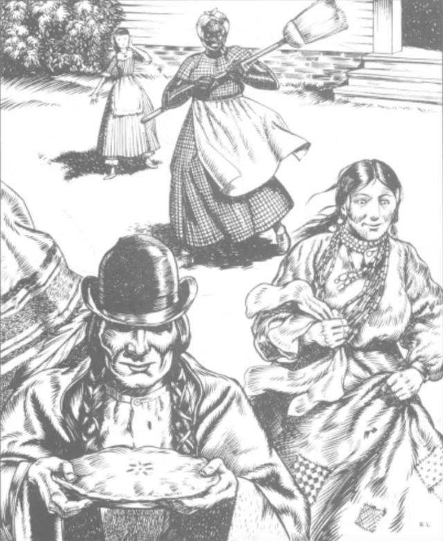 另有一段更有趣的,虽然文字说年少的母亲厌恶印第安人,但画面中却由女性黑奴举着扫帚赶走土著,白人女孩远远望着他们,双手干干净净如同她的道德一般“无暇”;下一页里她又被喧闹粗鲁的工人“吓坏了”。
