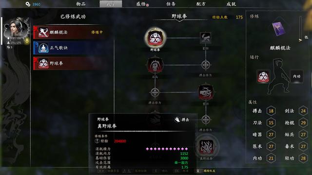 而且 天赋树还能跨越至 “刚”系,培养出杀敌后回复AP点的“劲风扫落叶”,玩家便能在一回合连续做出数次行动,在敌人尚未发力前便击杀有生力量。基于同样逻辑的还有挨打后积累的“爆击”量表、“虚招”量表以及对应的刚系、拙系天赋树等等。不同的天赋有着不同的侧重,再配以合适的武学,战斗同样可以做到有进有退,乐趣连连。