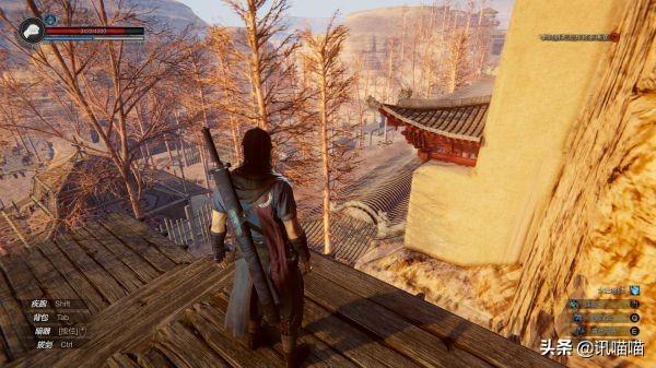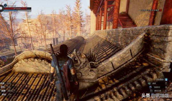 爬上九层阁右边的架子,对准图中下方的那个屋顶加速跳过去。注意要加速跳,一次不行多试几次。