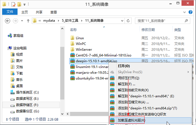 2. 选中ISO镜像安装包,右键,选择“加载至虚拟光驱”