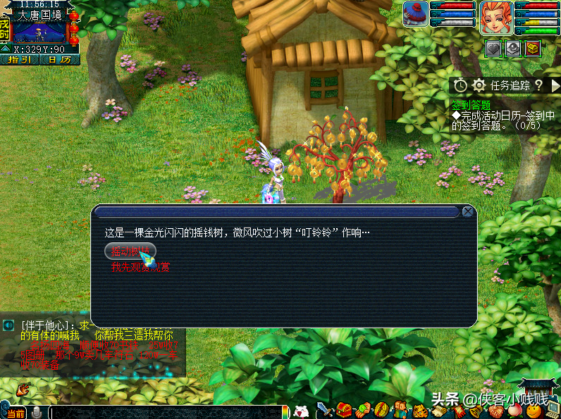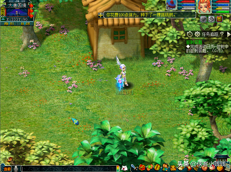 注意:1.种植树苗一般需要照料三次,从种植开始后每5分钟提醒一次,第20分钟时候成熟,每次最多操作三次,系统提示后需即使照料,否则会导致亏出血本的情况。2.摇钱树苗从种植到枯萎消失,存活40分钟,元宝则存留约4个小时,请及时拾取奖励。
