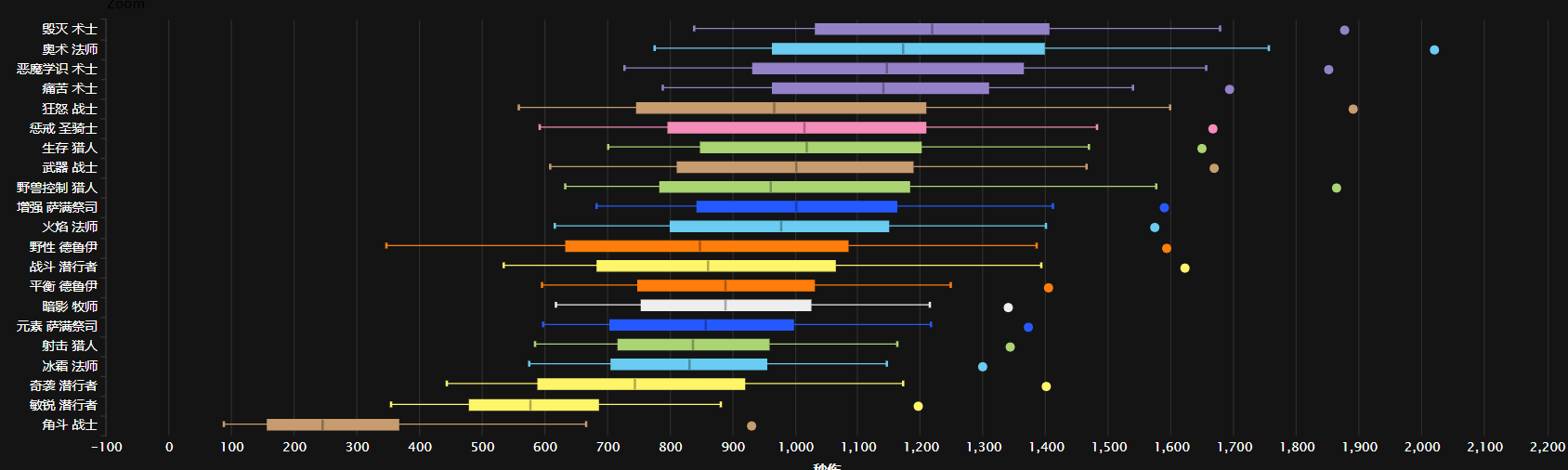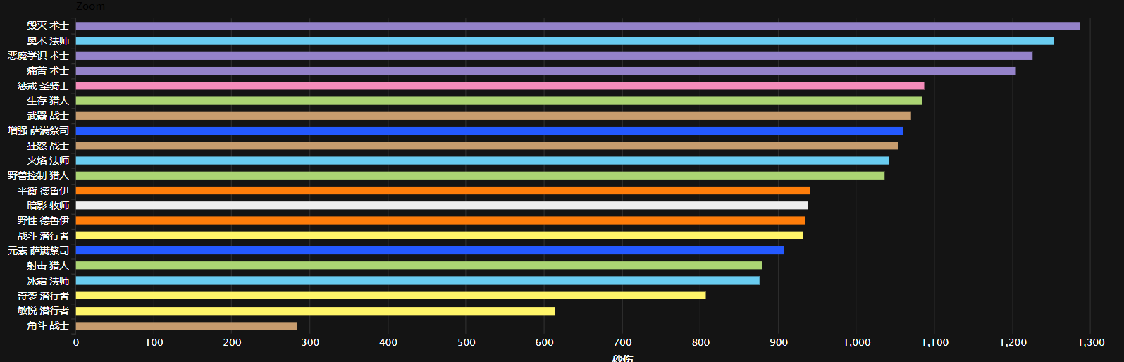 如果只看前60%玩家的数据,中高端惩戒骑的优势更加明显,他们的平均伤害完全压过了兽王猎和狂暴战,均伤达到了1208点,最高秒伤达到了2215点,仅次于第一梯队的奥法和术士,成为第二梯队的龙头。