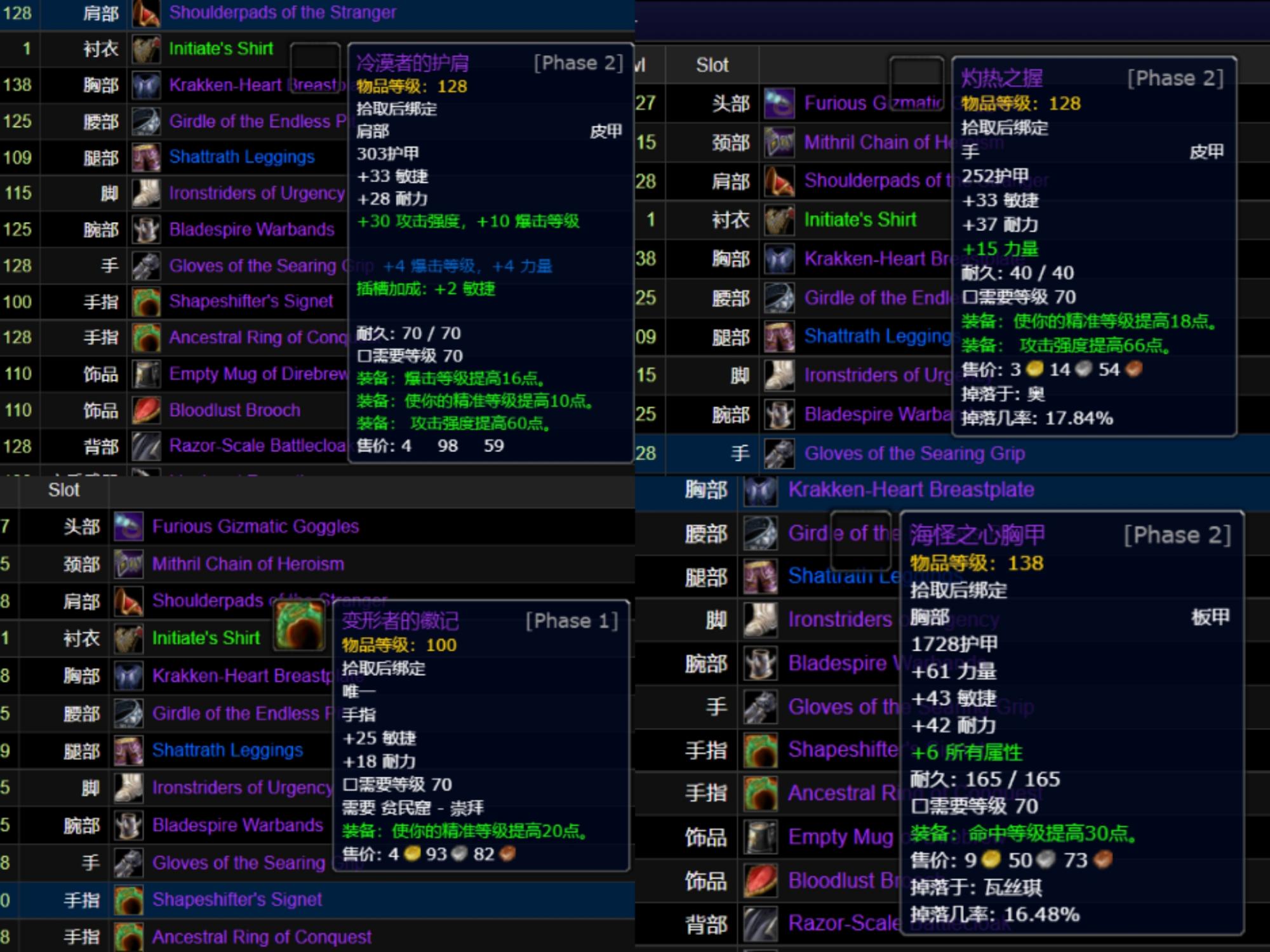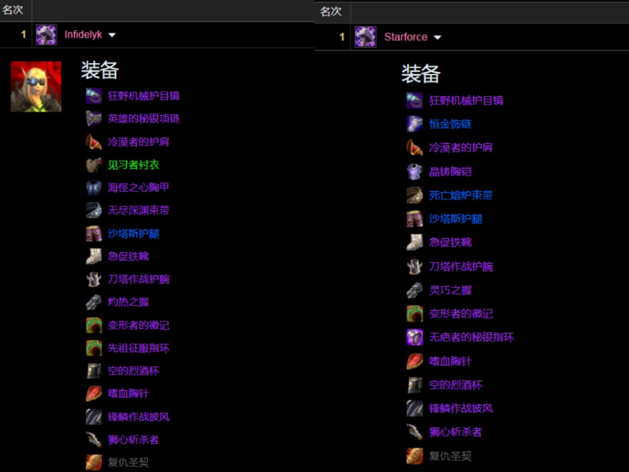 我们可以检查毒蛇神殿和风暴要塞排名第一的惩戒骑配装,就可以看到他们的配装惊人的相似:为了满足命中和精准需求甚至可以跨甲、武器使用狮心圣剑、饰品使用双牌子饰品(如果错过了美酒节饰品可以使用龙脊奖章)。