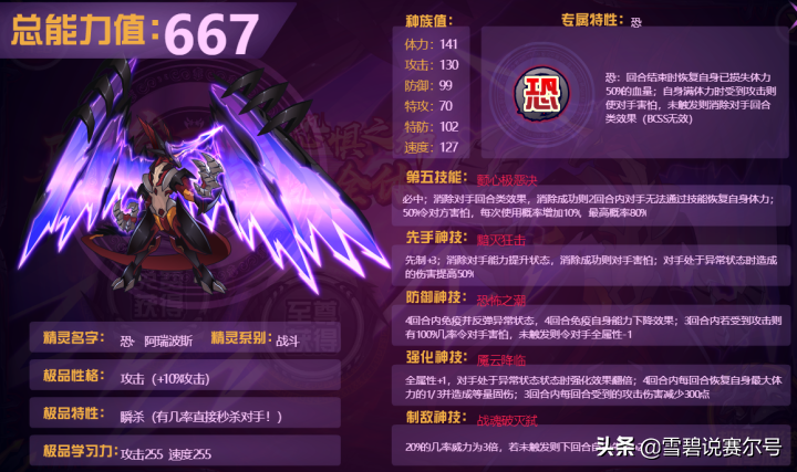 如恐惧之神的名称一样,阿瑞波斯在最早登场的时候,专属特性【空】10%概率令对手害怕。就是主动触发控场,虽然概率不高,但2014年仍然还是有玩家培养过这精灵。只能说守护索伦森的三只精灵,都不是很弱,专属特性也效果都不同。