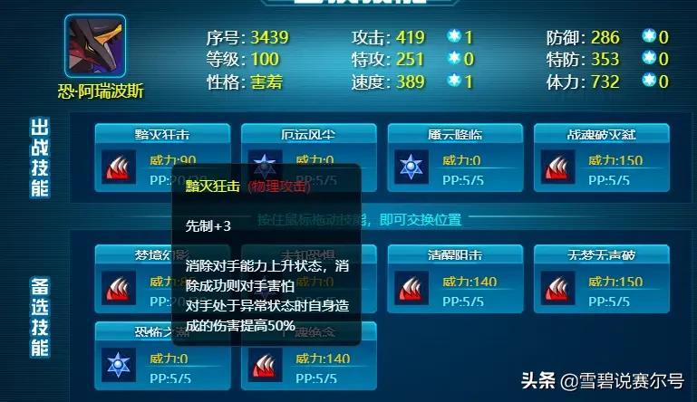 技能组方面:先3消强害怕控,没有补偿,处于异常增伤50%,也是少有的威力>85的先手技能。如果对手有异常,先3的威力效益最大可以增幅到90+45这样。