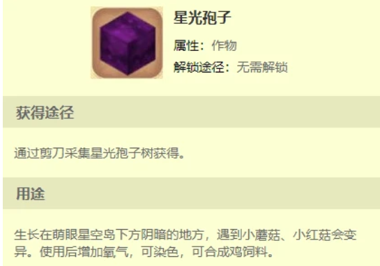 在玩家击败了主线的最终BOSS黑龙之后,其实游戏才刚刚拉开序幕。在游戏当中,玩家在此后就拥有了乘坐火箭前往外太空的权力。在萌眼星,除了玩家可以接触到大量超乎想象的奇妙生物之外,还可以采集到各种神秘的新道具。而在这之中,星光孢子就是最为奇妙的一种!
