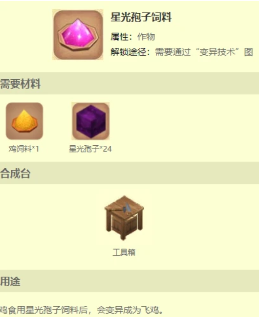 就比如我们回到地球之后,就可以开启变异技术图纸了。在此之后,玩家通过变异技术图纸,加上星光孢子和鸡饲料混合,就可以将家养的鸡变异。鸡有三种变异方向,分别是娱乐用的尖叫鸡、战斗用的战斗机和我们的主角飞鸡。其中飞鸡毫无疑问是最有用的,在合成星光孢子饲料以后给鸡吃下,它就可以完成变异了。