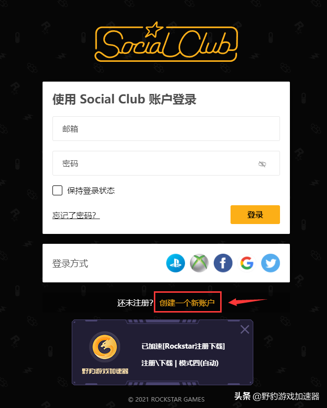 1.开启加速后,打开R星官网,点击右上角「登录」,弹出登录界面,点击「创建一个新账户」;
