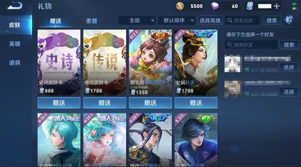 除了自己使用之外,皮肤卡还可以赠送给好友,赠送的流程也很简单,首先点击【商城】,然后选择【礼物】,在【皮肤】页面就可以看到两个皮肤卡,点击【赠送】,最后选择想要赠送的对象就可以了。
