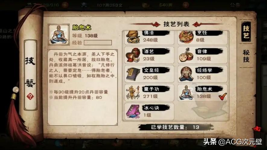 总的来说,游戏中御花术、驾驭术和胎息术都是非常不错的技艺,效果很不错,玩家要是有足够的点数的话,其实也是可以着重加在这3项技艺上面的。