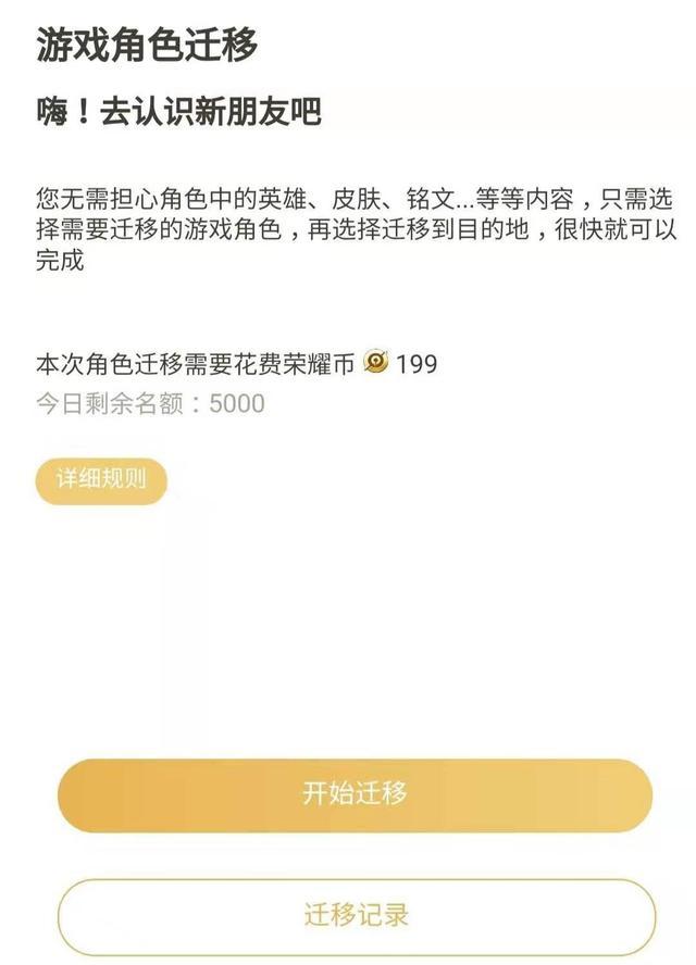 目前这个功能已经开始灰度测试,不过并不是每个人都有这个资格的,只有极少部分玩家会获得这个测试的资格,至于条件是什么,现在尚不得而知,上图就是获得资格的玩家爆出来的图片,从中我们可以看到,转区并非免费,而是需要199营地币,合人民币19.9而已,如果真正转区开始也是这个价格,那真的是良心至极啊。