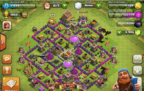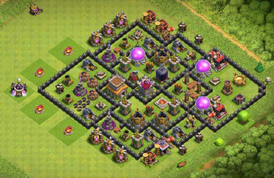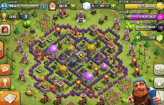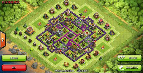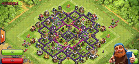 最外的箭塔和炮塔没有阻挡,狭小位置放置陷阱,法师塔、迫击炮活力均衡,防空塔三角之势、资源库分离。黑水与部落城堡在中间,防止援兵被偷袭;
