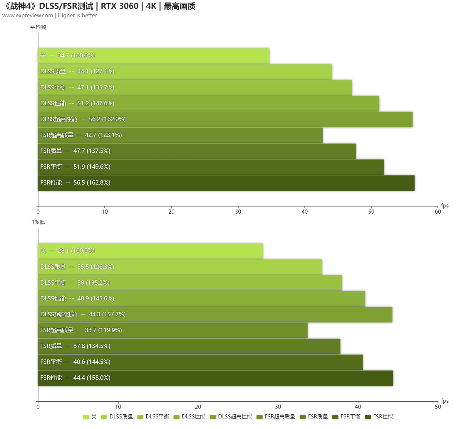 在对比完画质之后我们也用RTX 3060测试了在4K分辨率下各模式的DLSS和FSR的游戏帧率,看看两者对游戏帧率的提升幅度,同样是使用最高画质。