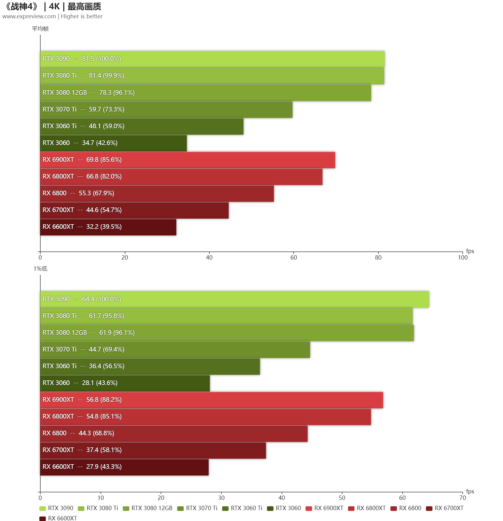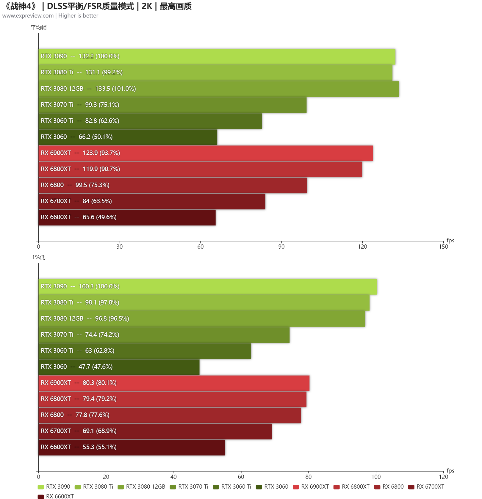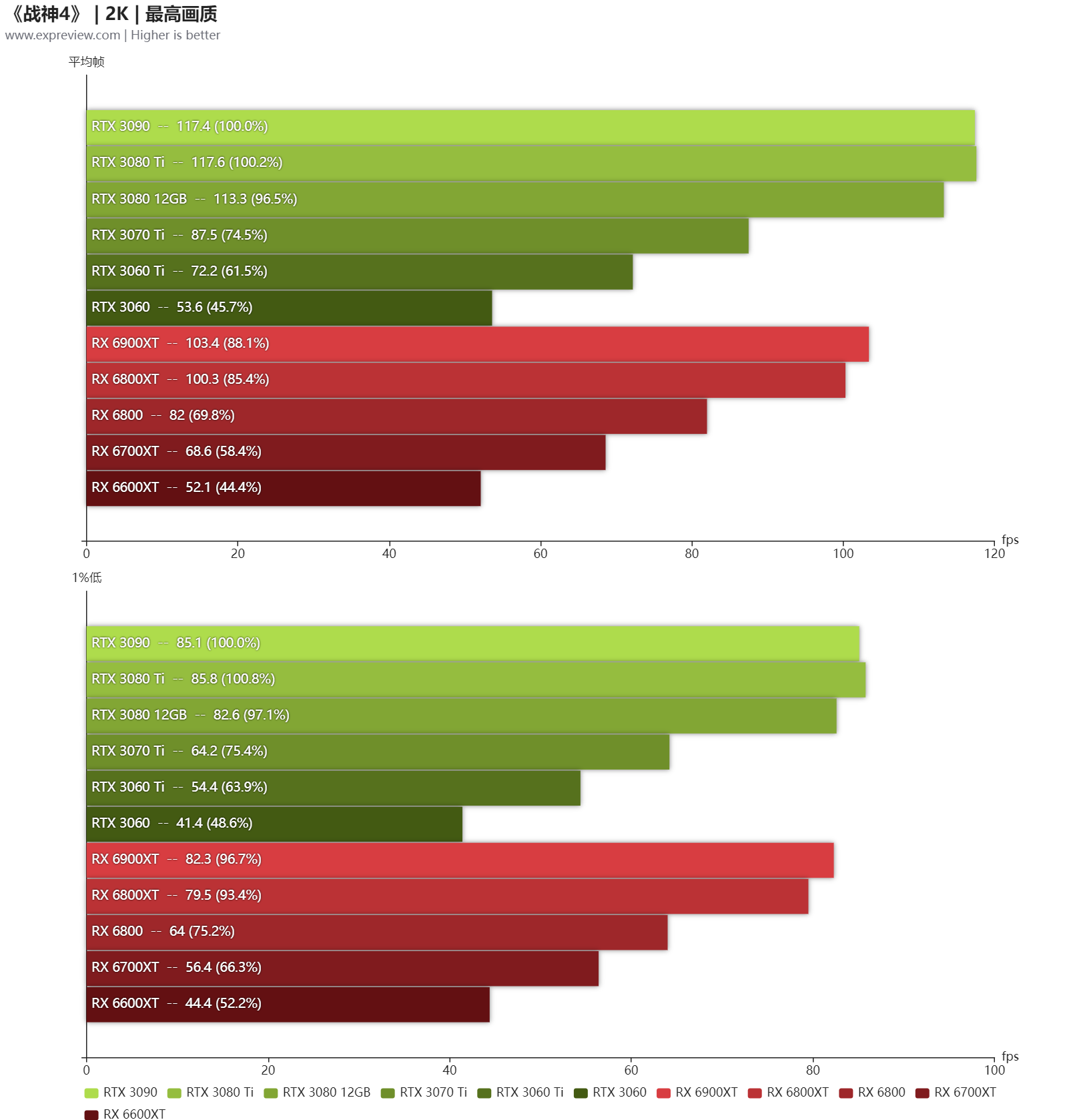 在2K分辨率下RTX 3060和RX 6600XT的平均帧率都低于60fps的,需要使用RTX 3060 Ti或RX 6700XT以上的显卡,追求2K高帧率的朋友可能就需要RTX 3080或RX 6800XT以上的显卡。