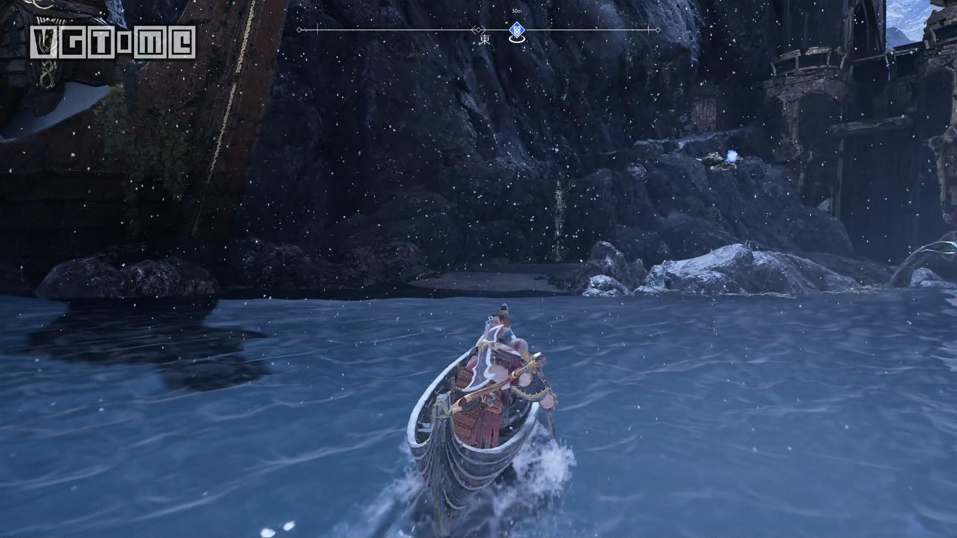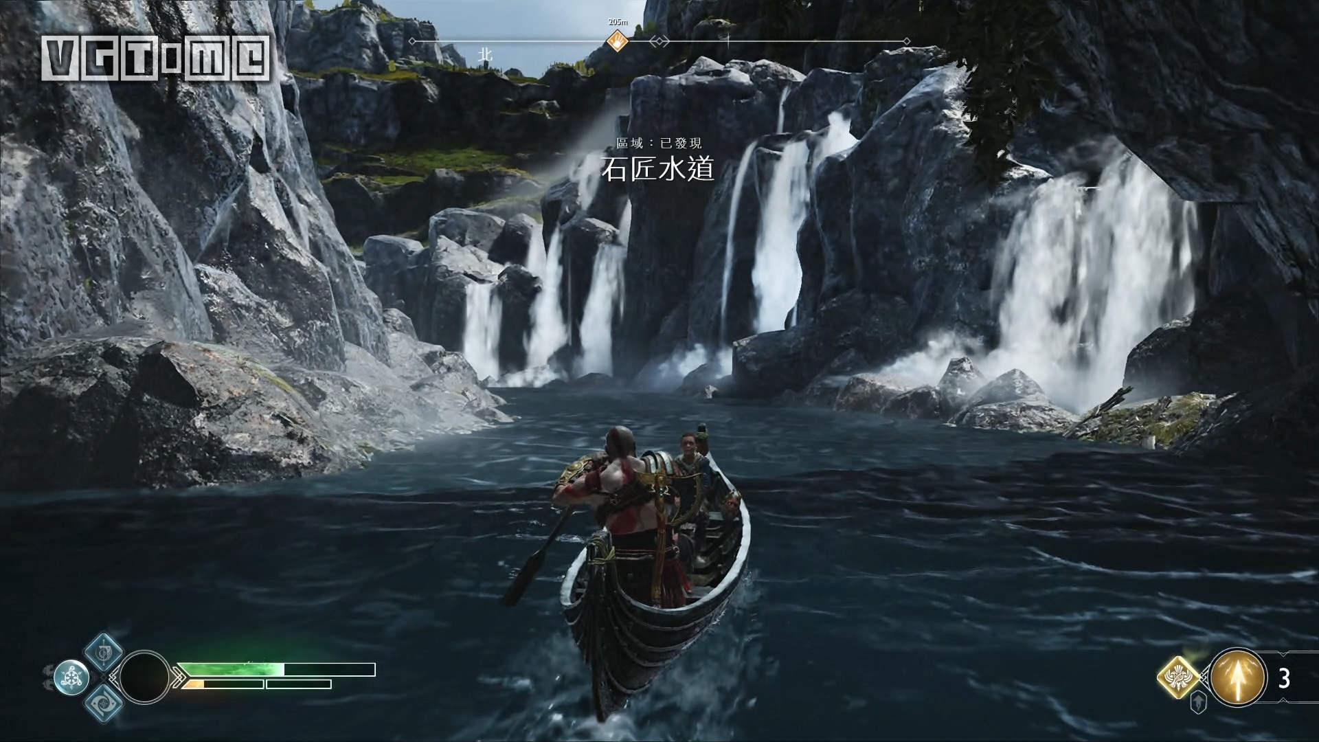 在“石瀑布”船坞登陆,进入中间的圆形区域后往右后方看,可以用斧子把桥放下来。