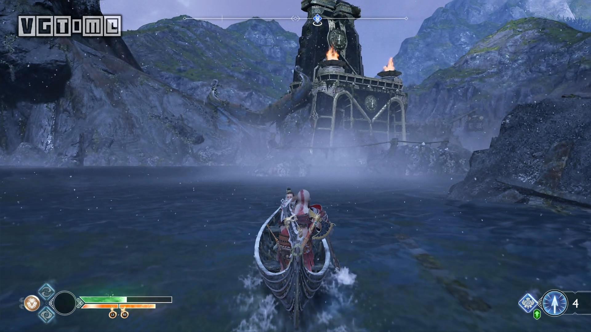 从下图的船坞登陆,爬到上层点燃火盆。