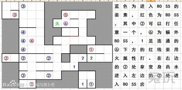 首先是开始,出发点在左边的2处,然后在1处进入建筑物(右下的小地图),在①处救出美人鱼之后进入海底,打倒①的boss这个地方就完成了;然后走到② 处,打倒颜色特别的怪之后掉落变身药水,然后往左走到②处,吃药水进入boss房,打倒BOSS,此处通关;然后走到④处,其中一个房间的墙上会有密码,然后走到村庄中间的④处,攻击下方的3个柱子输入密码进入BOSS房,打败,此地方通关;直接前进到③,打倒绿名怪即可进入boss房,打倒即可;直接走到⑤处打败BOSS即可