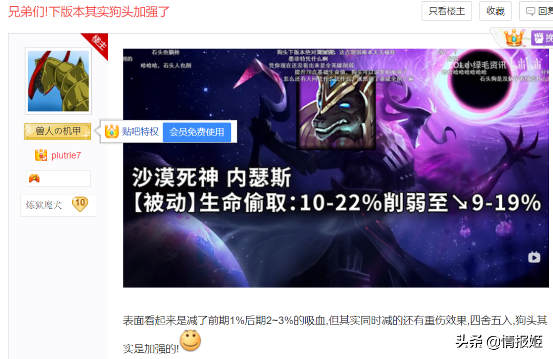 当其他吧玩家抱怨英雄数值和机制不再强大从t0t1宝座跌落的时候,狗头吧的老哥们在口耳相传:兄弟们!狗头并不弱!