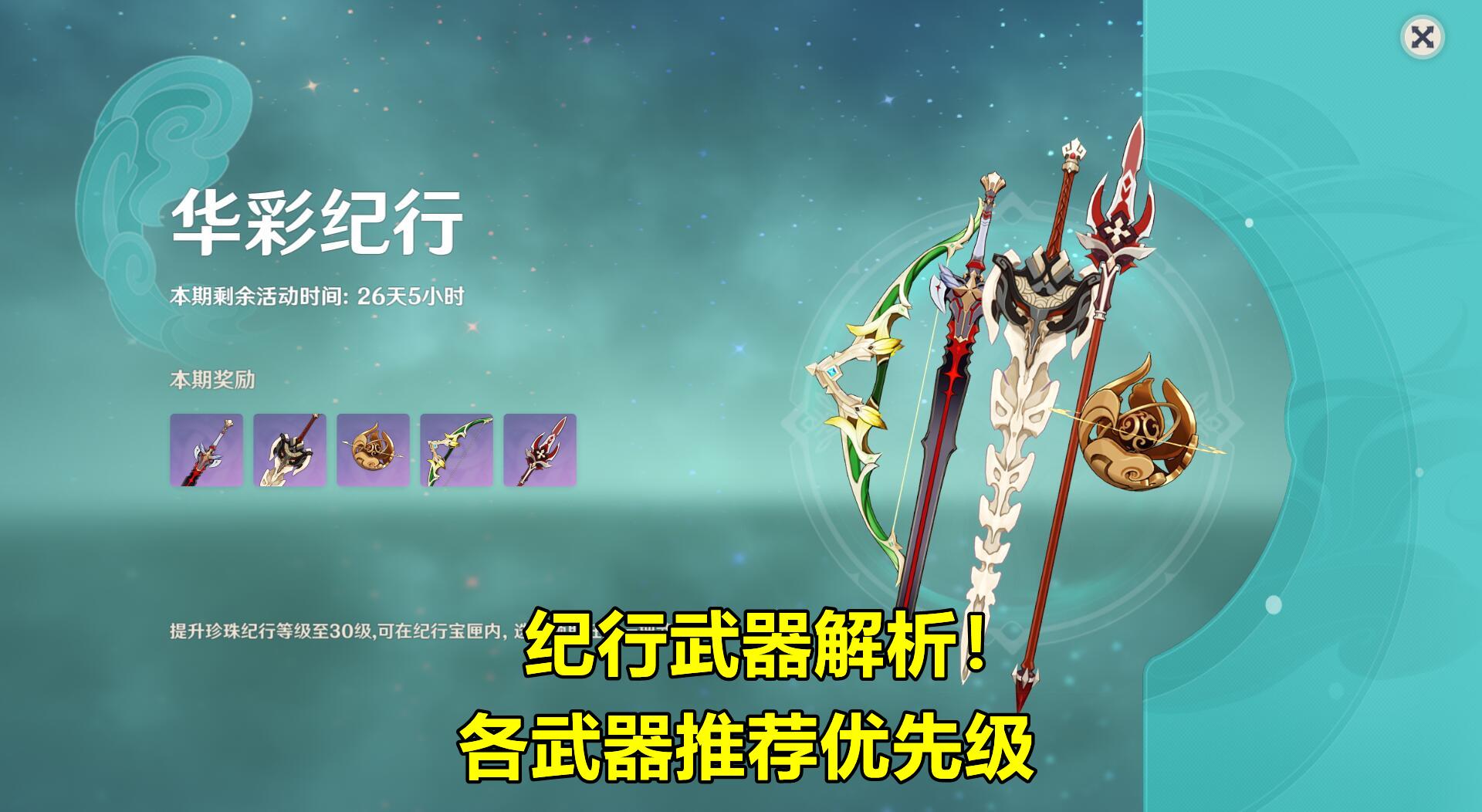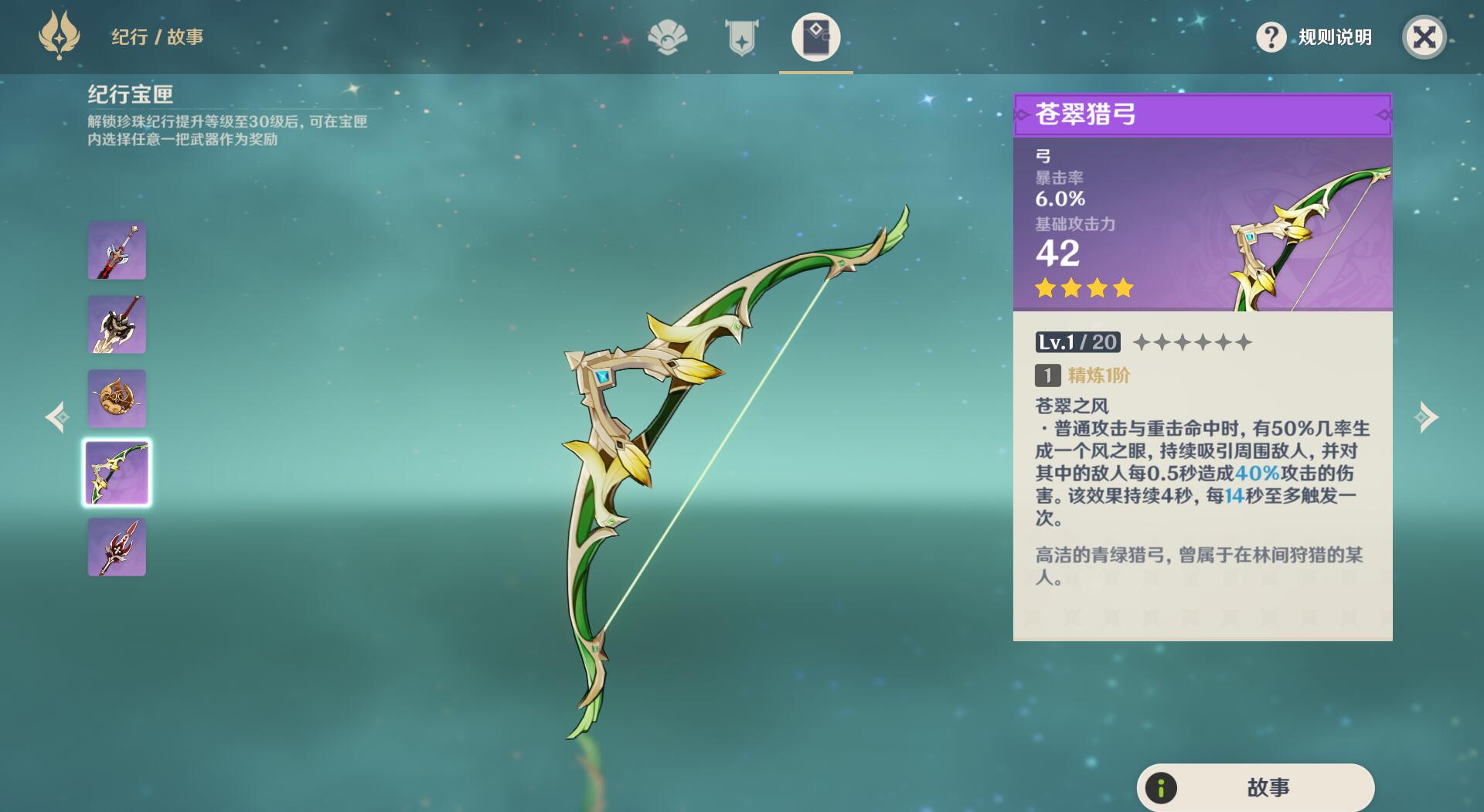 购买“珍珠纪行”的玩家,每期升到30级后,可以从黑剑、螭骨剑、匣里日月、苍翠猎弓、决斗之枪中选择一把武器。