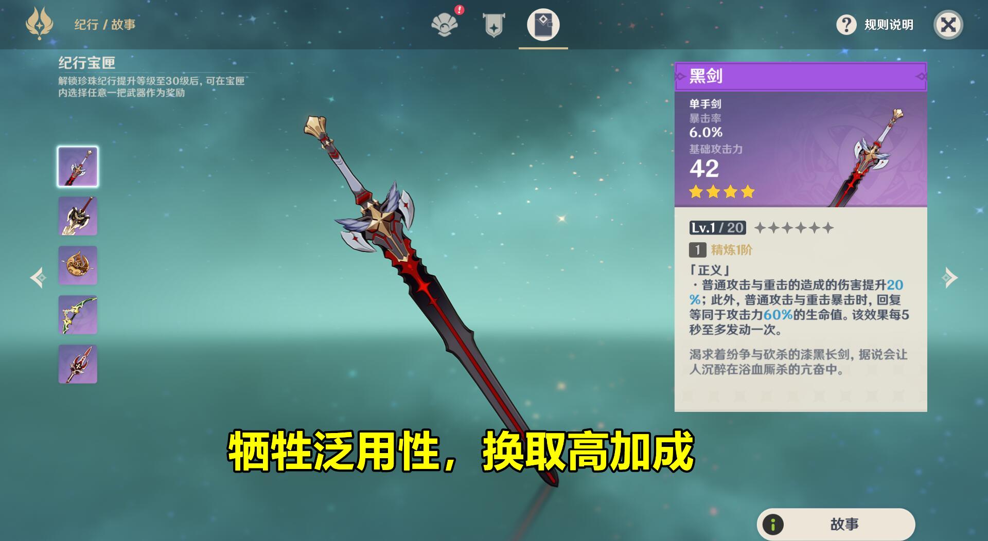 从属性上看,【黑剑】只能算是4星武器的一般水准,比上不足比下有余,虽然技能加成较高,但也是限定普攻和重击两种攻击方式,属于是“牺牲泛用性,换取高加成”。
