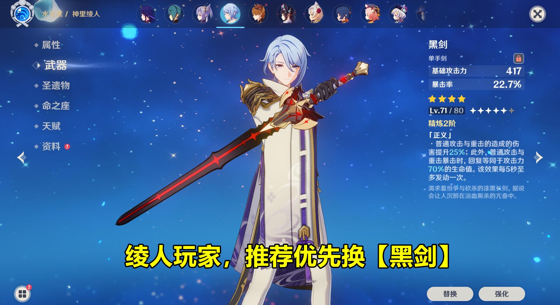 一般情况下,并不太建议优先换取【黑剑】,但对于主玩神里绫人,而又缺乏5星武器的玩家,推荐优先换取,并且应该尽量满阶。