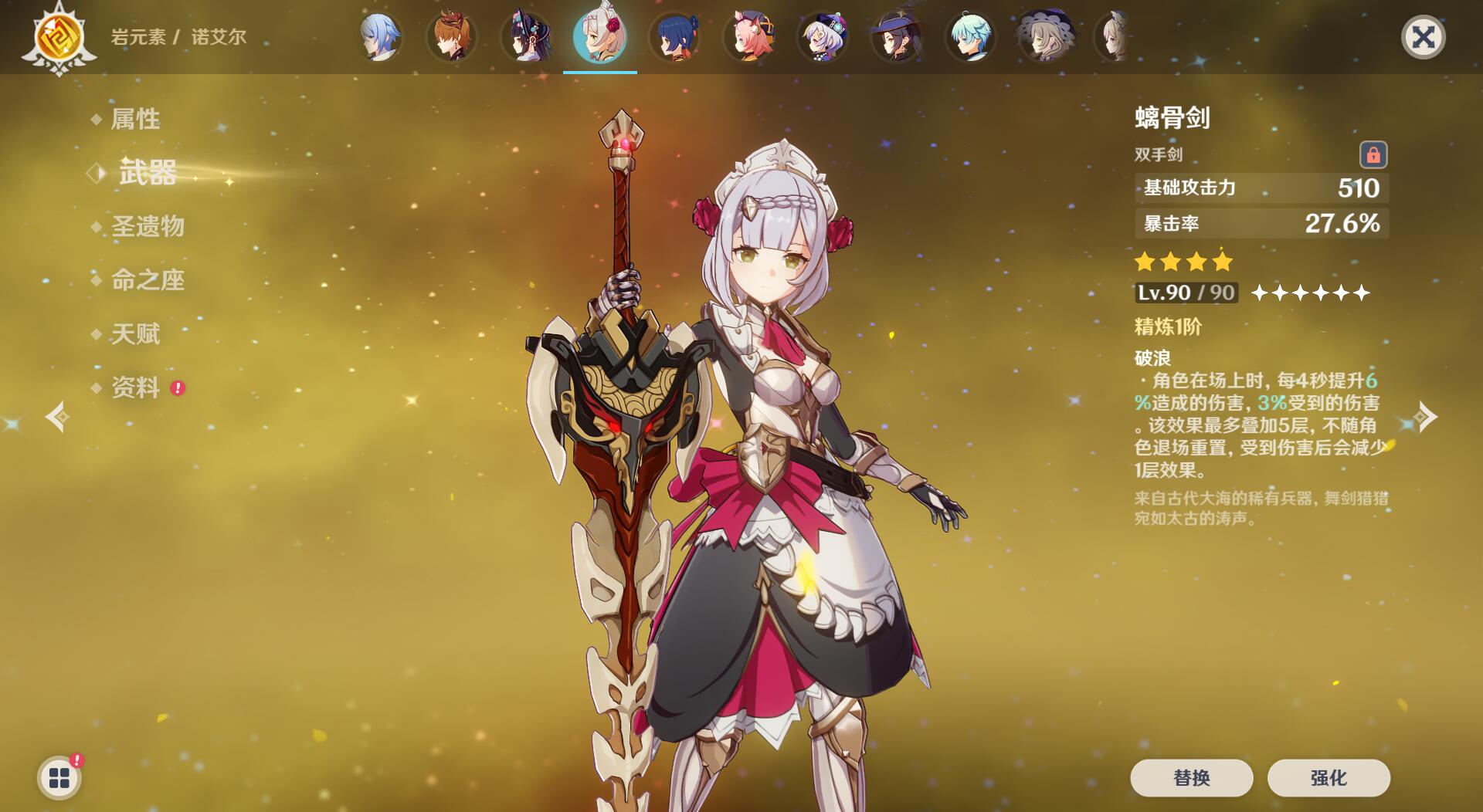 90级拥有510基础攻击力和27.6%的暴击率。普攻命中时,提升E技能和大招20%/25%/30%/35%/40%的伤害,E技能和大招命中时,提升普攻20%/25%30%35%40%的伤害。