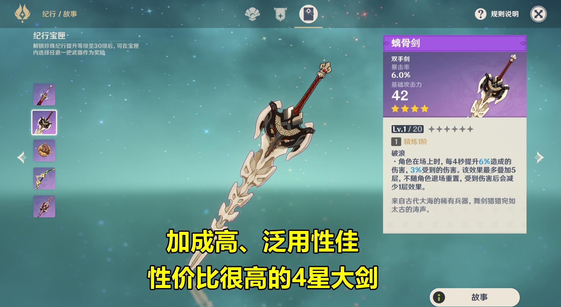 如果单纯地从武器技能上看,【螭骨剑】应该是纪行武器中最具性价比的武器,在开服初期也被称之为“4星神器”。90级可以提供510点基础攻击力、27.6%暴击率。