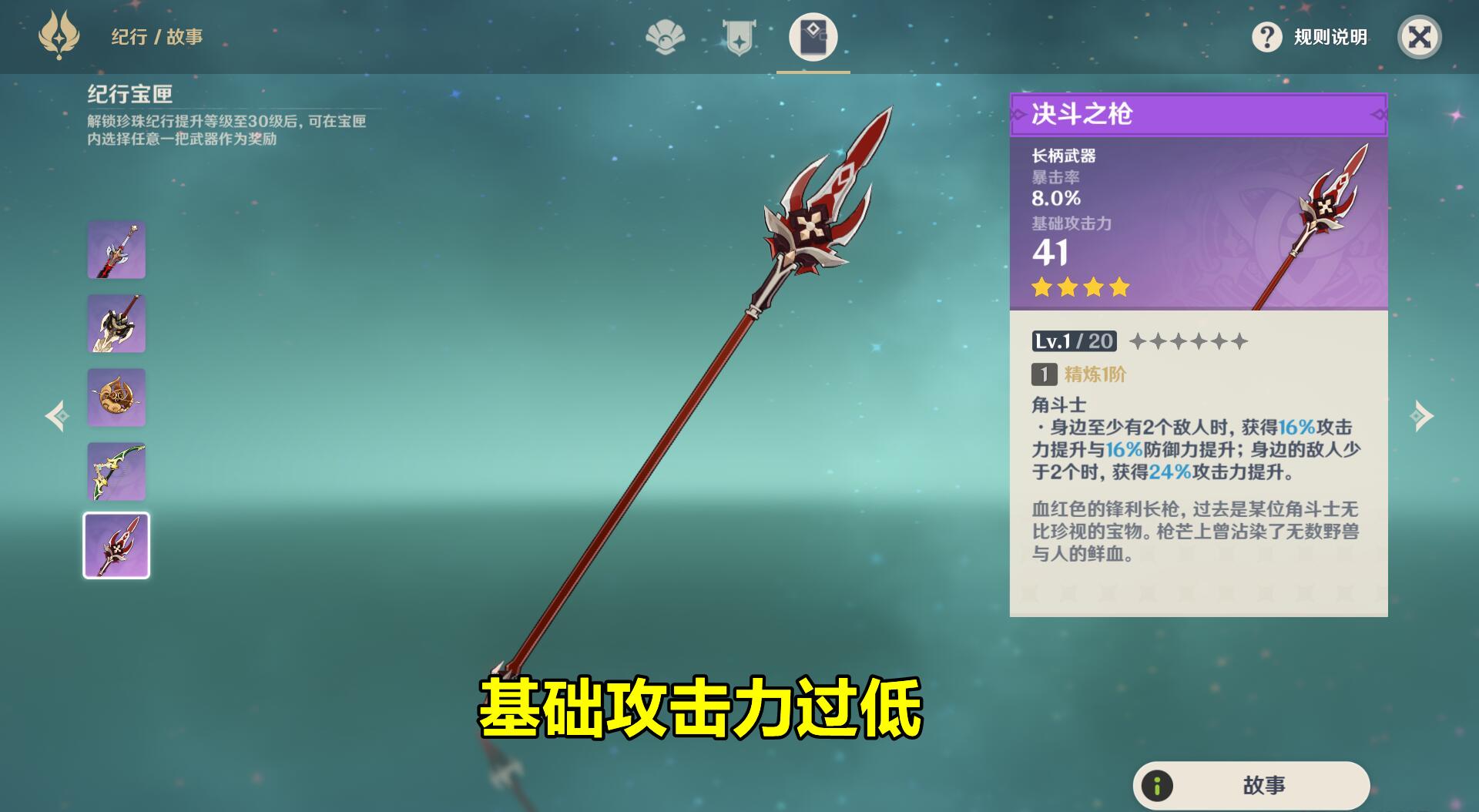 唯一的缺点就是,基础攻击力过低,导致其和五星武器之间存在过大的差距……但说实话,如果有的选,谁又会放着五星武器不用呢?