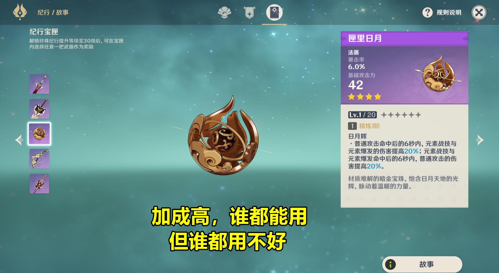 这把武器最大的问题在于不加成重击,而对绝大多数法器类主C来说,重击都是输出的重要组成部分,因此,【匣里日月】属于典型的“谁都能用,但谁都用不好”的武器。而由于其加成时间只有6秒,对八重神子这类脱手副C角色也并不友好。