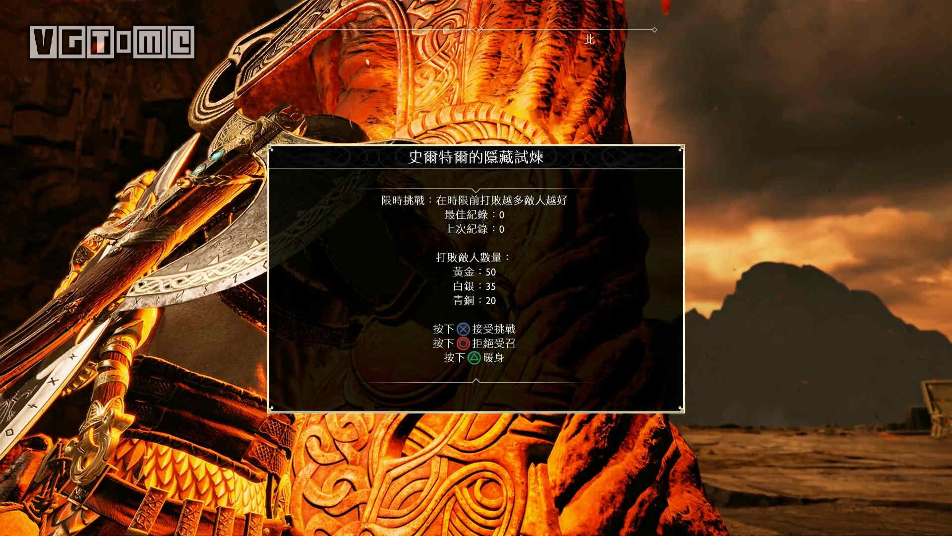 获得三个钥匙之后回到山顶,开启“史尔特尔的隐藏试炼”(即试炼VI 逆天)。该试炼为限时挑战,在时限内尽可能杀死多的敌人,杀死超过20/35/50个敌人可以获得青铜/白银/黄金评价,而如果想要拿到奖杯“火焰与硫磺”,需要打到黄金评价。