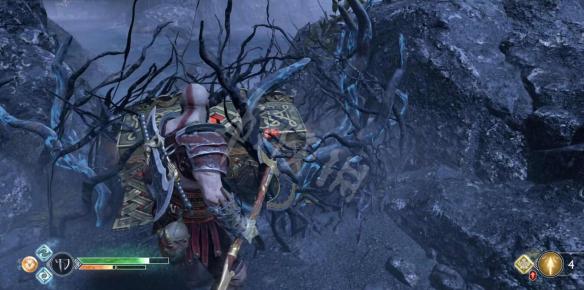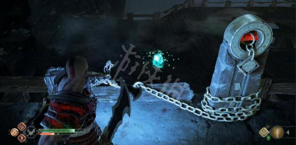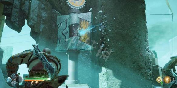 接着去石球的背面,先用链刃把挡住可以爬上去的墙的树枝烧掉,然后带着上一个标志的能量爬上去,传递个上面的石球。