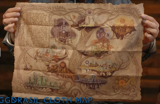 除此以外,该玩家还尝试分析了巨人版中的世界树布制地图——布制地图展现了坐落在世界树枝干与树根上的九界,这张地图上也有讲述故事的符文,这次是关于布罗克和辛德利的一些细节,兄弟二人锻造了奎托斯的利维坦之斧。