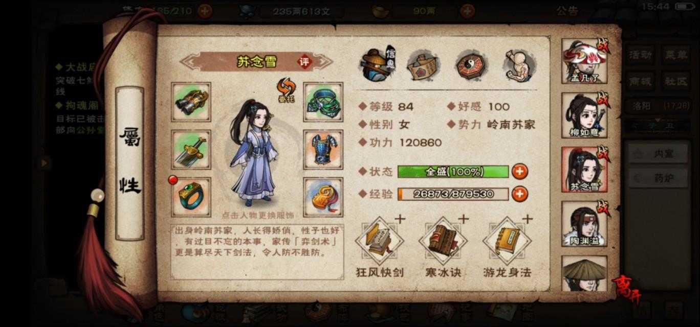 苏念雪:苏念雪的资质是比较适合使剑的,选择女性伙伴这是许多玩家的信仰哈,目前版本野外最强上乘剑法是狂风剑法,不过这是拘魂阁的专属武功,想要进六扇门的同学注意了。