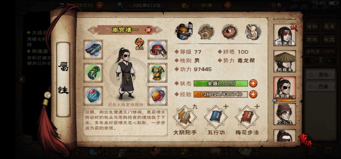 田鹏:田鹏是在完成南阳渡主线时获得,是一个比较偏肉的伙伴很适合抗伤害,而且伤害成长也不低,同时可以增加10%阅历获取。(升级天赋后,可改名叫南宫靖一)