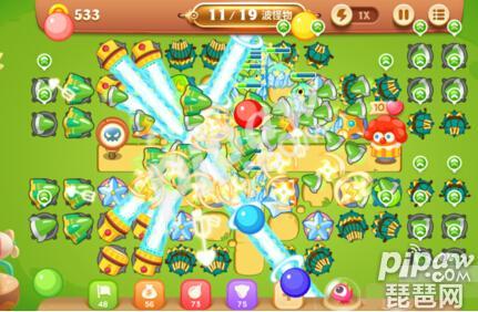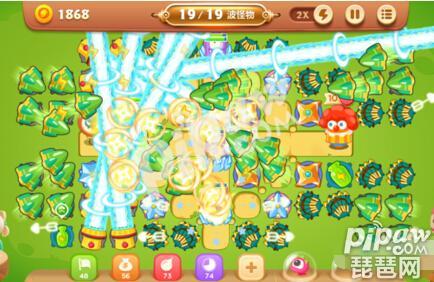 这个关卡有一只大BOSS还有19波的怪物,而且这个关卡还有隐形炮塔,所以一开始我们需要尽快的将隐形炮塔给清理出来,首先我们可以用上宠物的大招,将中间位置的障碍物先清理掉,这时候我们就可以获得四个章鱼了呢,然后我们先升级这些炮塔,然后在出口的位置放上冰冻星,减缓怪物的速度呢,然后一边清理障碍物,会继续挖崛不少的隐形炮塔。