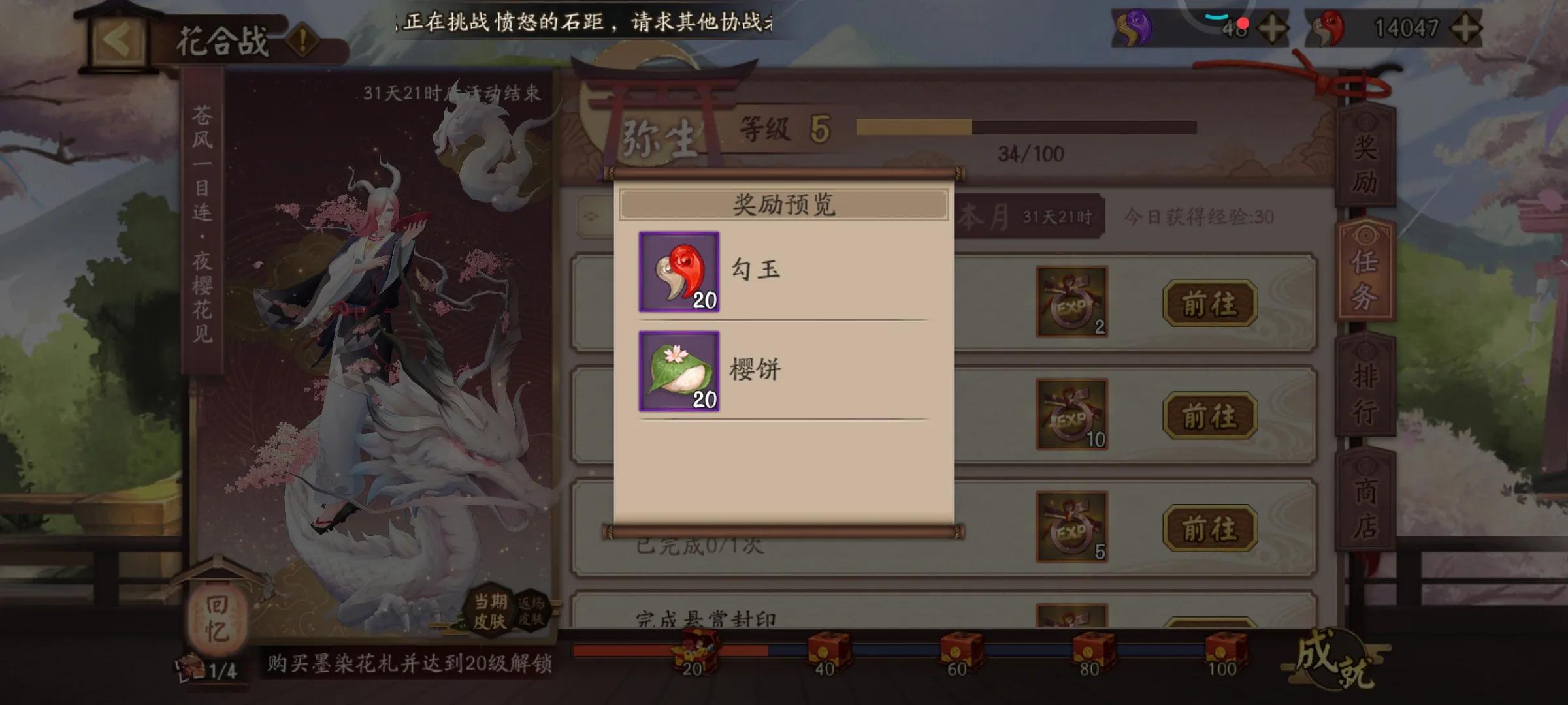 每天打完花合战100经验也是有20勾玉奖励的,随便挂下副本轻松到手。