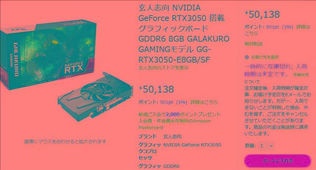 日本亚马逊上目前已有RTX 3050显卡预售,售价50138日元,约合人民币2789元,相比建议零售价溢价将近50%。