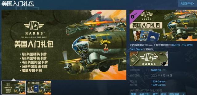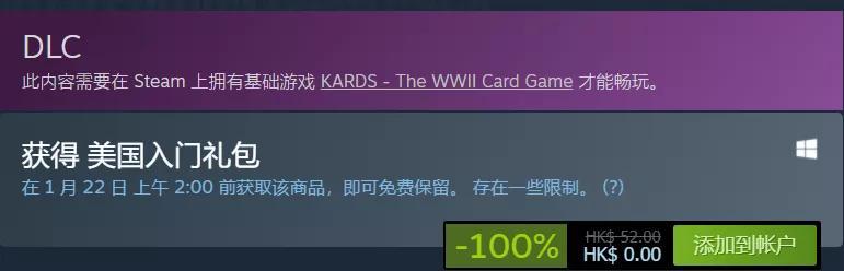Steam特别好评二战卡牌游戏《KARDS》现已推出全新DLC,今日起一周内可免费领取,并不是永久免费,下周六(1月22号)将恢复原价37元,喜欢这个类型的可以领取。另外,游戏本体是免费的,每个人都可以领~
