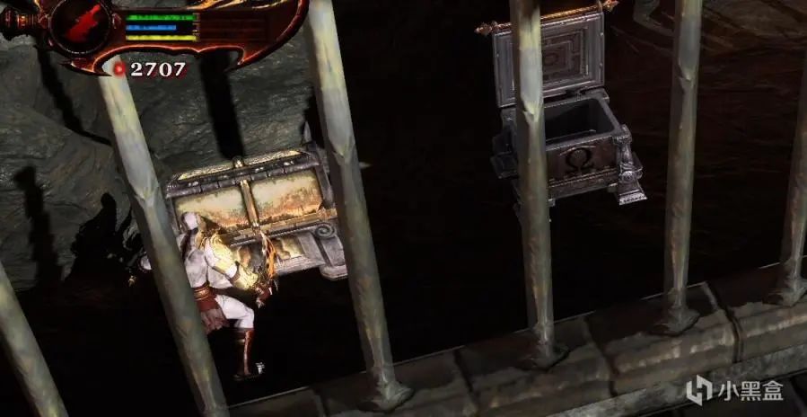 继续前进,门前面的怪有两波无法擒拿,拉开距离打掉一个盔甲就能撞了,这里不推荐刷狗,直接开大打过去。进门之后看到鸟人,过了第一个坑之后底下有宝箱。之后回头勾引左边的鸟人过来,自己站平地最右边,往上面右边飞拿宝箱,获得米诺陶洛斯的厉角、蛇发女妖眼