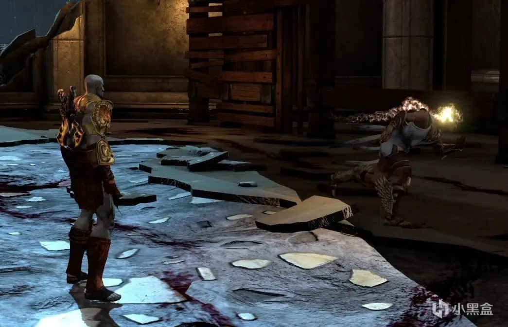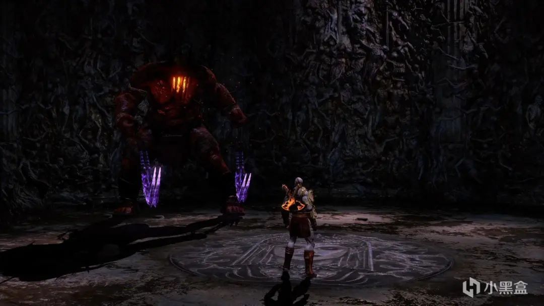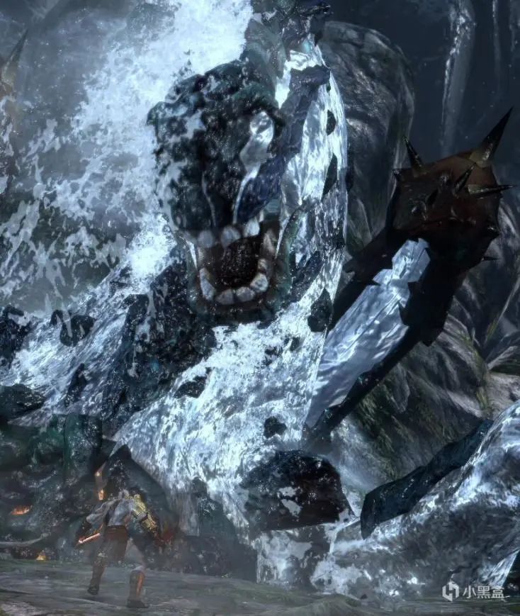 之后继续前进,开门遇到第二只海马。这只就比较憨,通过右摇杆向下拨贴边站,海马的近战攻击是打不到你的,之后通过5次□一次△下血,当然操作自信也可以直接干,触发QTE进入第二阶段,注意用R2格挡喷水,之后触发QTE。