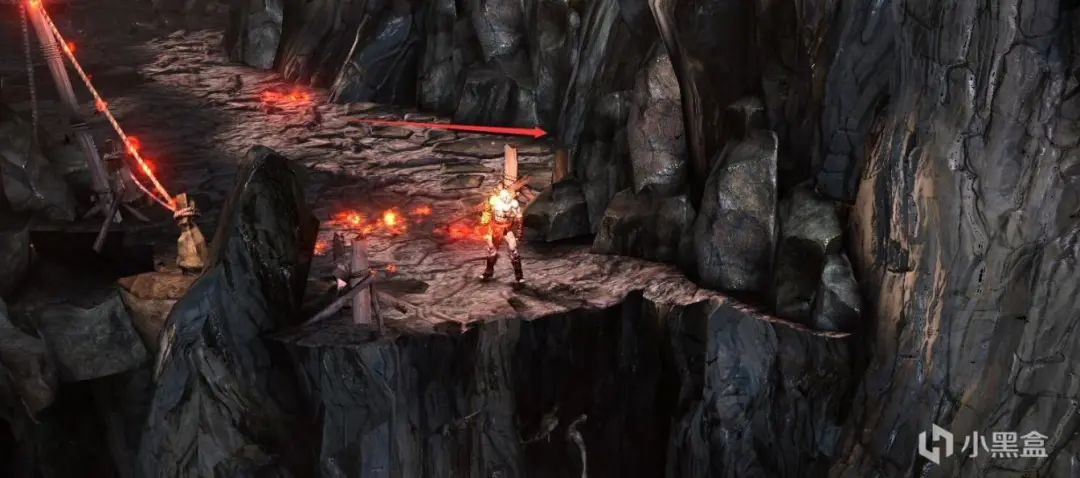 往右走到地面尖尖的石头处再跳,之后再慢慢往右走,上去有珍贵宝箱。