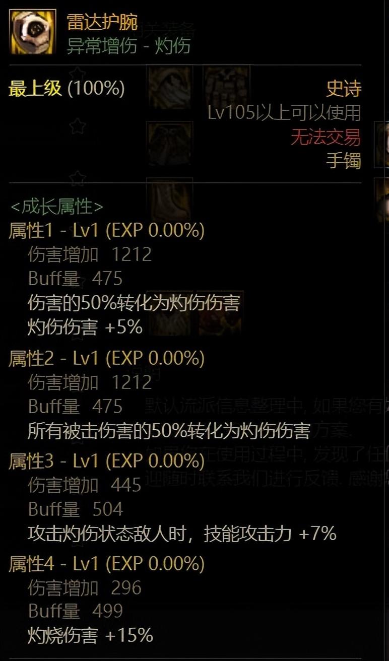 基本上就是把感电手镯换成了灼烧手镯,左槽换成了灼烧左,大部分跟感电流一样。这个构筑下,当决战武器特效能够提供3.45%伤害时与制式武器持平,3上位加点能够提供接近2%的提升,算是用少量伤害换取了功能性。