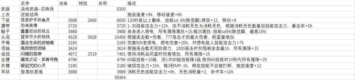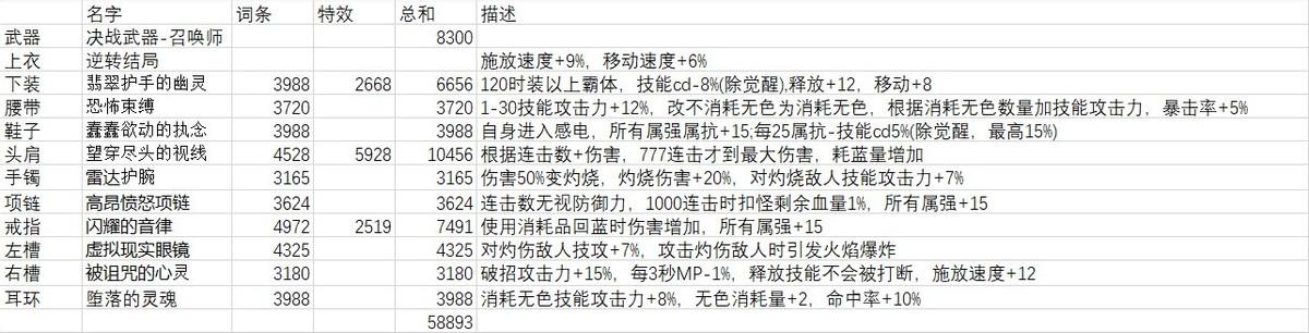 感谢小熊为我们测试出了召唤物能够吃到异常增伤词条。无色流消耗过大,不是很建议平民使用。HP消耗流的核心组件手镯会将HP MAX-99%,经小熊测试直接召不出卡西利亚斯,同时过低的血量容易死亡,召唤死亡惩罚过大,并不推荐。MP消耗流大部分装备都是以“伤害增加”为主的,不太符合我想要压低其数值减少决战武器的损失的想法,同时召唤兽攻击无法触发回蓝效果,对于平民负荷可能也不小。因此,可以确定比较主流的方向是“异常”流。