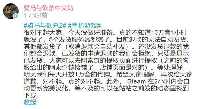 《骑砍2》也确实不负众望,堪称上线就成爆款,一小时就把骑砍中文站的十万储备全部买光,还有82%好评。此势头和舆论反应,似乎可以与前不久的动森、DOOM、半条命VR有的一拼。3月30日下午5点,《骑砍2》一开放激活码领取,骑砍中文站被庞大的人数挤得几次崩溃,一小时后便下架了购买CDK的渠道。原因无他,只是玩家实在太过热情,中文站储备的十万CDK一小时售光,要知道中文站仅仅发售CDK,还有不少玩家选择在Steam上直接购买,《骑砍2》的销量可见一斑。
