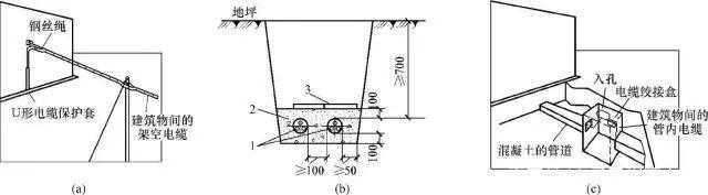 (a)架空电缆布线;(b)直埋电缆布线;(c)管道电缆布线